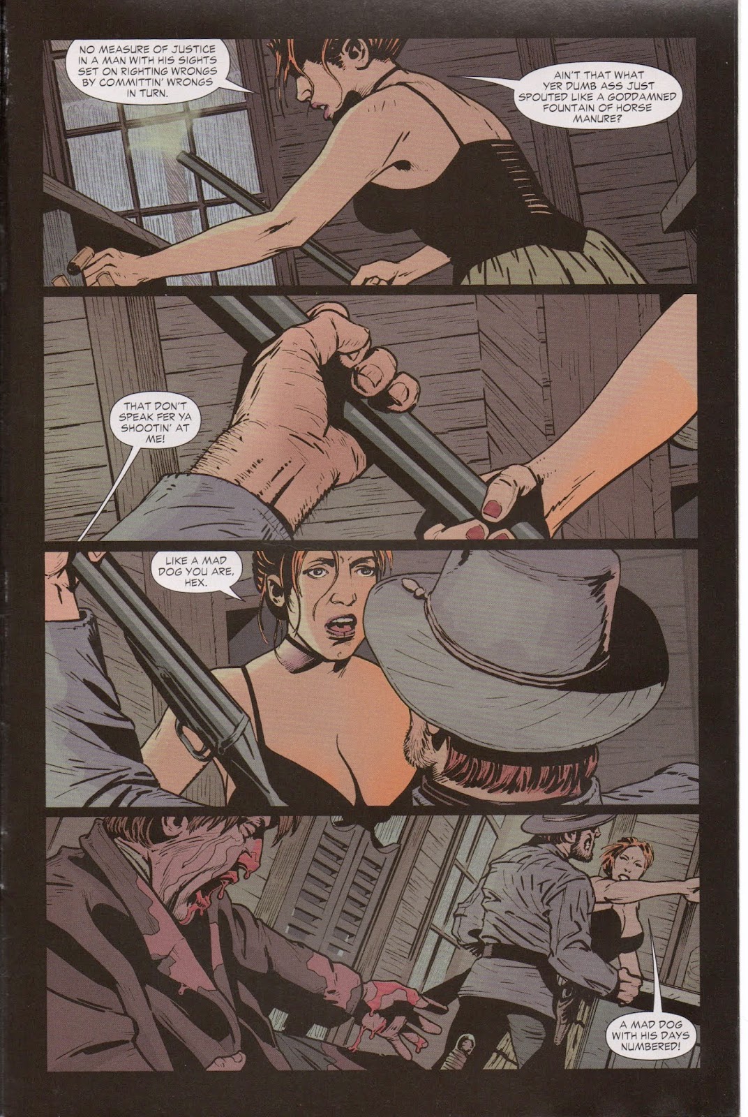 Jonah Hex is getting a shave at a barber when Fiona comes in and starts tearing him up one side and down the other. The barber leaves and then we hear Fiona screaming about money. It's obvious that Hex has asked for payment. Hex says that he doesn't do charity and she reminds him they were both there five years ago when Billy's parents were killed. Hex even paid for the funerals.