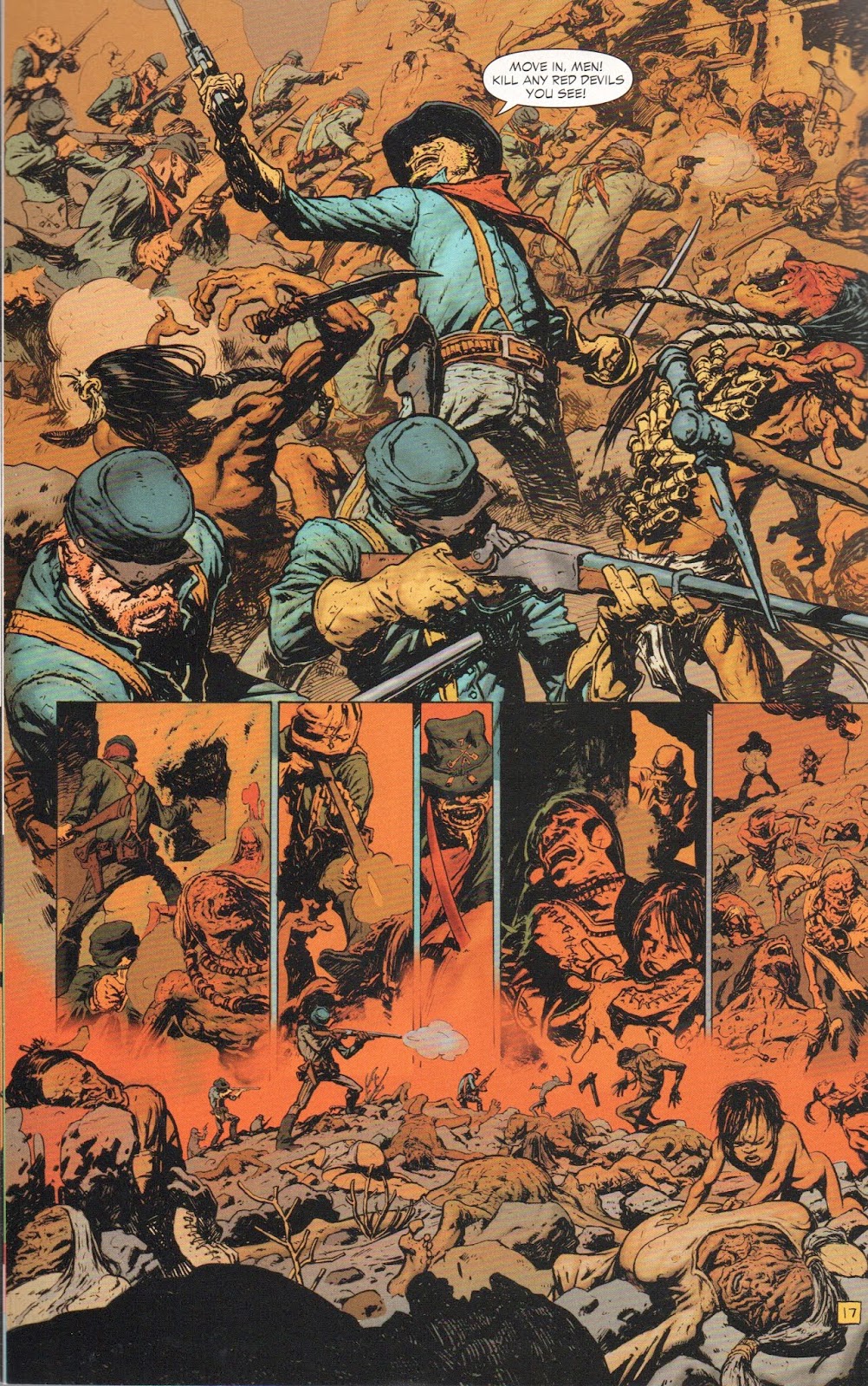 With an animalistic growl, Billy rushes forward and kicks Montgomery's dead cranium as hard as he can. This produces a chuckle from Hex. Jonah tells Billy that the man is dead but Billy tells Hex to get away from him. The three surviving robbers kneel and lock their fingers behind their heads as Hex tries to restrain Billy. Billy looks around, spies Jonah's pistol and quickly liberates it from the holster and gets off four quick shots, killing the three robbers and injuring a patron.