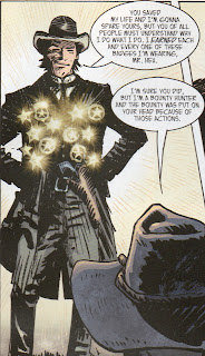 Back to present day, the man of light stand over Hex and we realize he is Victor. Victor postulates he has been tracked by Hex for three days and Victor is now worth four hundred, maybe six hundred dollars? Jonah states the amount is now one thousand dollars and asks if Victor is gonna kill him or just blind him with that coat? We then see that the light coming from Victor are Sheriff badges from lawmen he has killed over the years. He has been gunning down crooked lawmen as he roots them out after learning of the corruption back in New York.